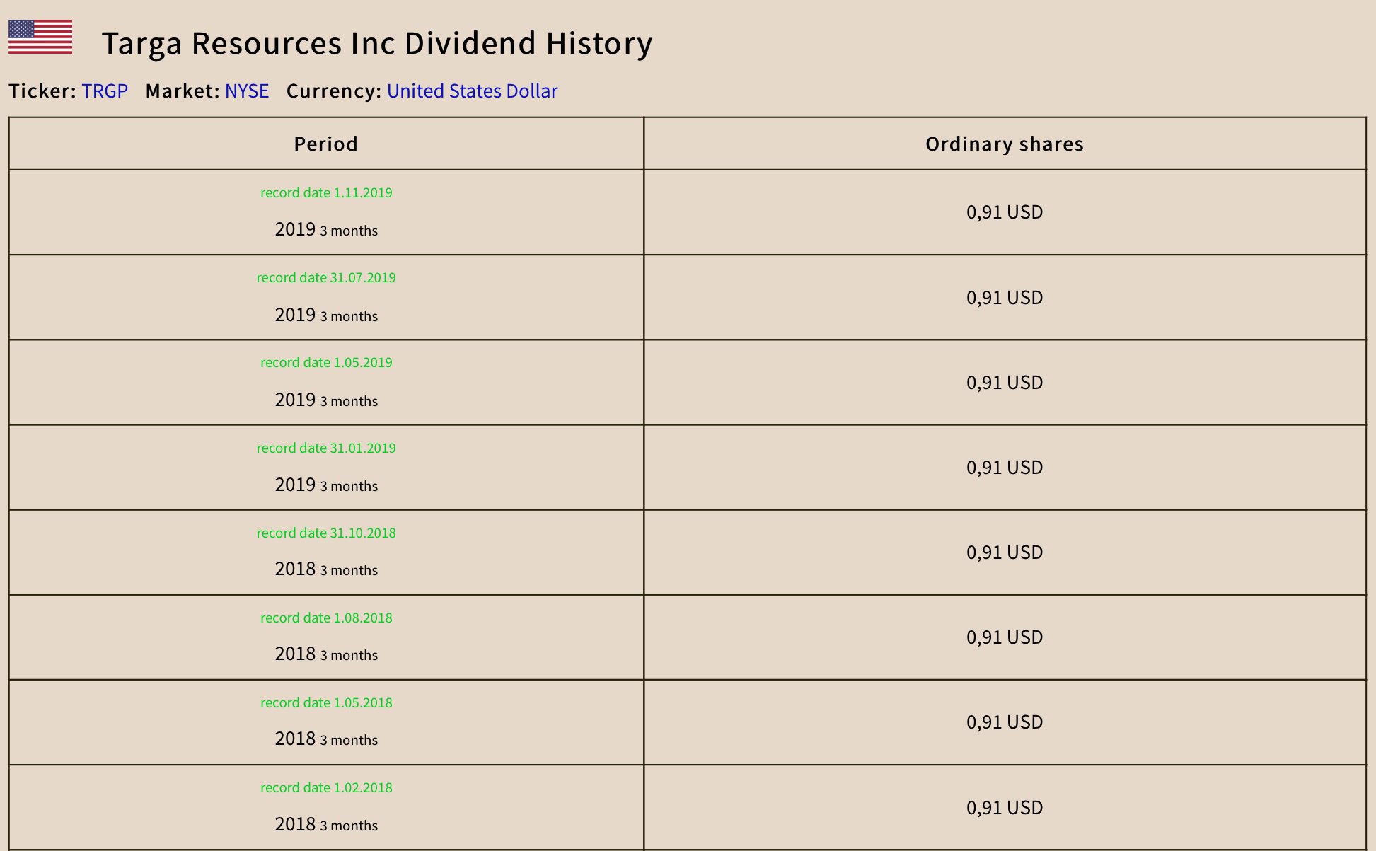 The current ttm dividend payout for targa resources (trgp) as of november 19, 2021 is $0.40. In depth view into targa resources preferred stock dividend (quarterly) including historical data from 2010, charts, stats and industry comps. This brings the dividend yield to 0.74% based on its recent close price.